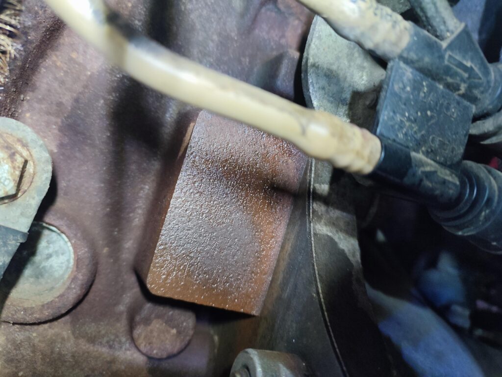 Dann ein weiterer Bildhinweis in einem Forum. Laut dem Werkstatthandbuch befindet sich die mysteriöse Zahl am Motorblock hinten links am Getriebe. Verbogen unter dem Auto kauernd und mit der Endoskoplampe bewaffnet geht die Suche weiter. Zunächst sind da nur ein paar Striche zu erkennen. Mit zusammengekniffenen Augen und etwas Phantasie kann man daraus ein paar Ziffern formen. Fast zur Unkenntlichkeit verblasst, hat Sven sie nun tatsächlich gefunden. Erleichtert atmen wir aus.