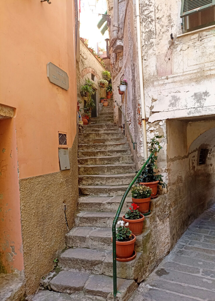 Statt Giorgio kämpfen sich Sven und ich dann zwei Tage darauf zu Fuß durchs Gestrüpp. Der offizielle Wanderweg ist unglaublich steil und von feinster, staubartiger Erde umgeben. Keine Stufen oder eine Möglichkeit Halt zu finden. Dafür jede Menge Dornengewächse links und rechts von uns. So rutschen wir 270 Höhenmeter in die Tiefe. Die Schlussetappe ist nur noch gebückt möglich und dann fallen wir plötzlich mitten am Touristen-Hotspot raus. Völlig verschwitzt, zerkratzt und von Mücken zerstochen (was nur mich betrifft, Sven bleibt da verschont), stolpern wir schnurstracks zum Meer. Wir genießen das kühle Nass und atmen erst einmal tief durch. Monterossos Stadtbild zieht mich bei Tageslicht nicht so in den Bann wie Riomaggiore, doch bei einem Aperitivo am Abend in einer schnuckeligen Gasse sieht die Welt doch gleich anders aus.