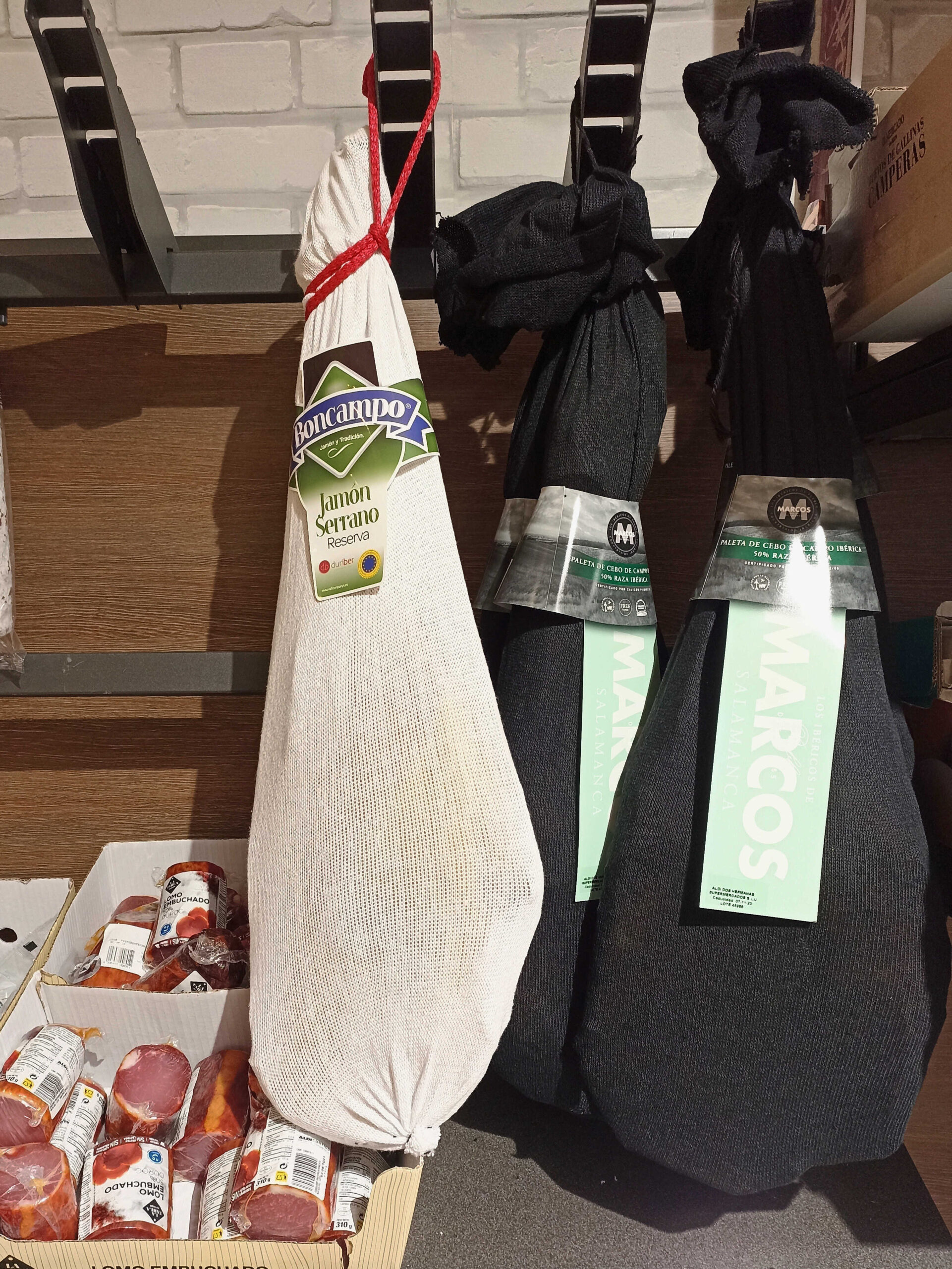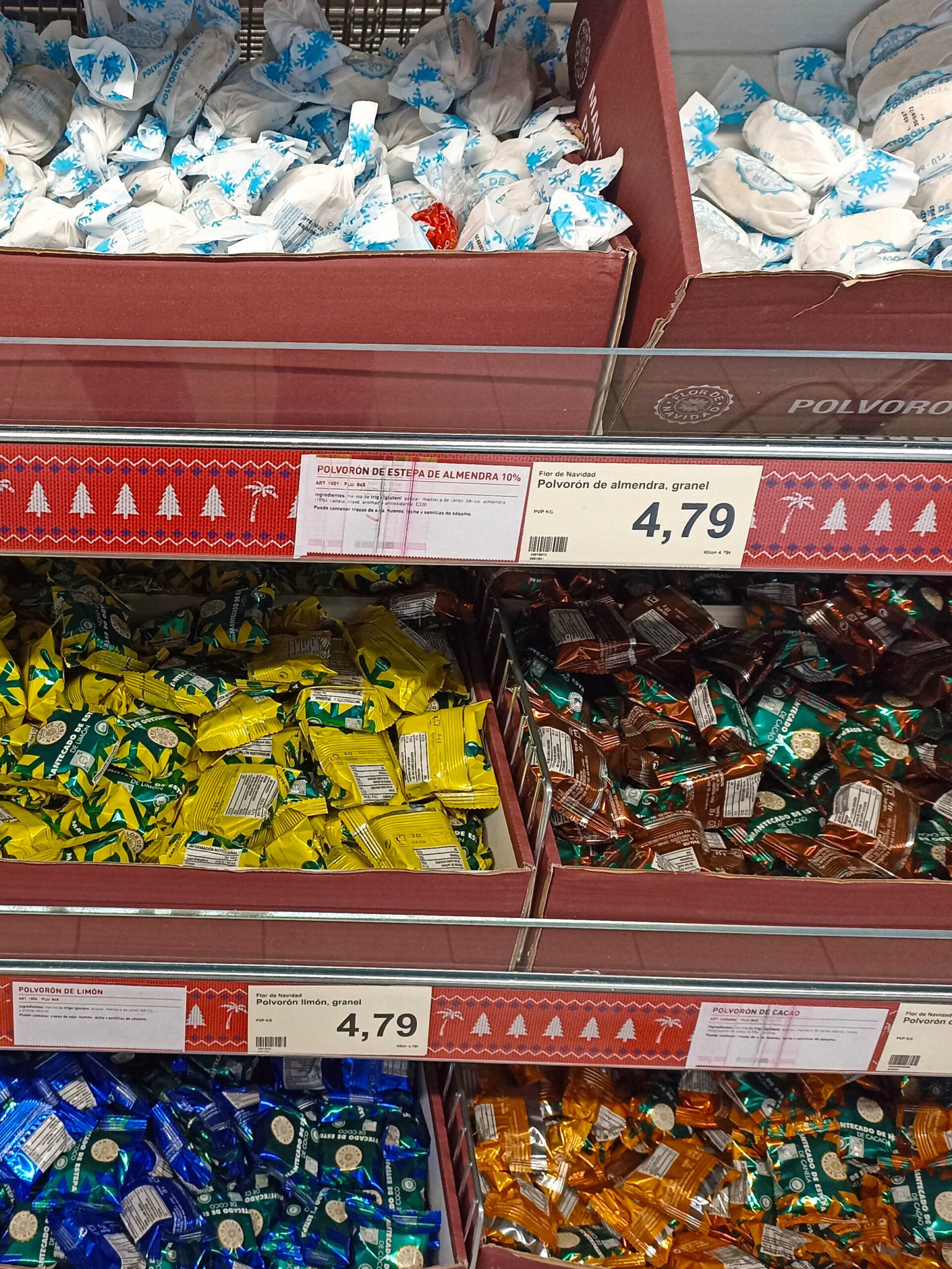 Die Straßen sind mit Lichterketten verziert und am Ortseingang leuchtet meist ein großes „Bonnes Festes“ oder „Feliz Navidad“. In den Supermärkten hängen riesige Schinkenkeulen an den Wänden. Serrano Schinken, Iberischer Schinken. Mal pur, mal in einer Art Schinkenstofftasche zum Verschenken. Daneben sind die Regale voll mit süßen Weihnachtsleckereien, die einem in buntes Papier gewickelt entgegen lachen. Spanische Weihnachtsplätzchen? Begeistert füllen wir eine Tüte voll. Die sogenannten Polvoróns erweisen sich beim Geschmackstest in der Tat jedoch als ziemlich pulverige Angelegenheit.