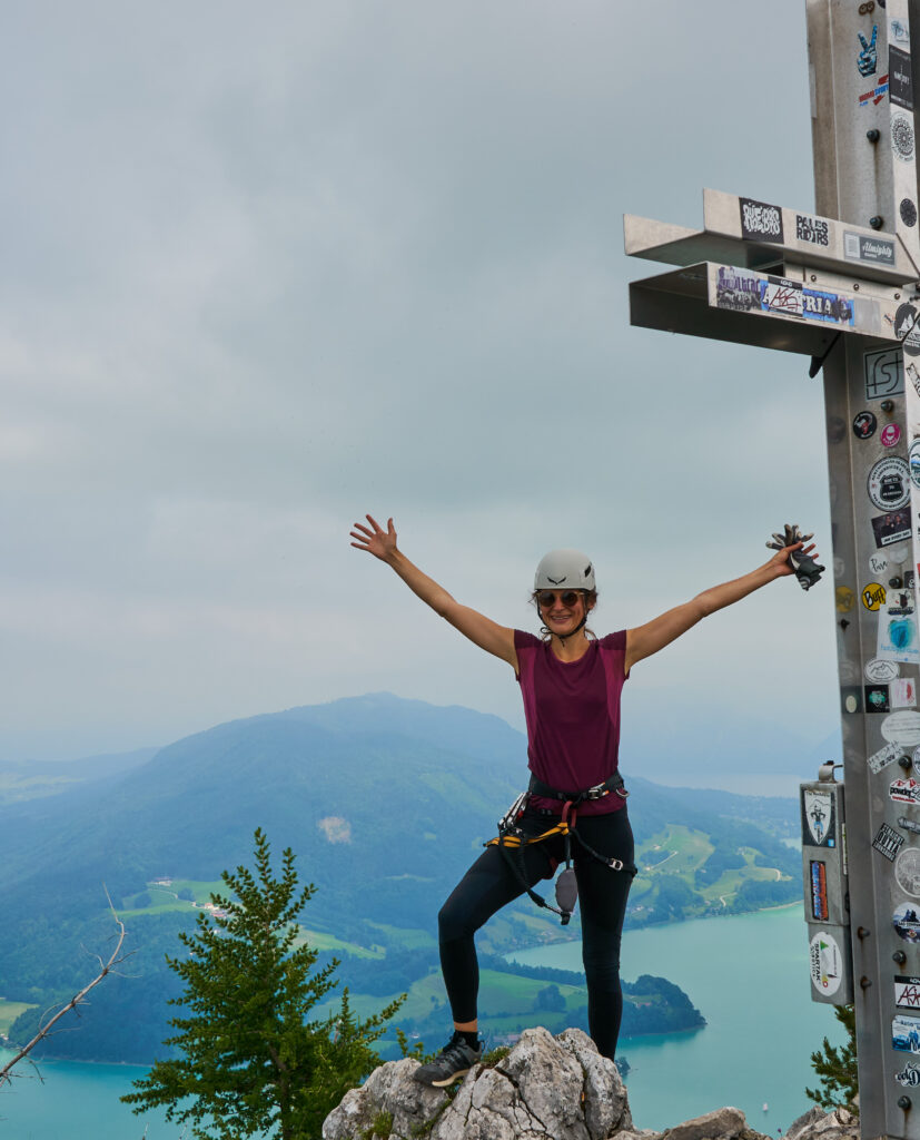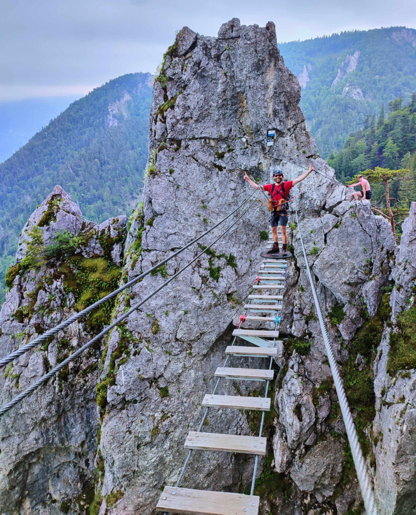 Nächster Tag. Ich bin durchgeschwitzt, Schweiß läuft über mein Gesicht. Meine Hände klammern sich fest, konzentriert klettere ich ein Stück weiter auf dem Rücken des Drachen. Die Aussicht ist herrlich, das Wetter gigantisch. Wir befinden uns bereits seit zwei Stunden in der Drachenwand. Nur noch ein paar steile Grate, dann haben wir das Tier bezwungen und sind an seinem majestätischen Kopf angelangt. „Welch herrlicher Klettersteig“, denke ich mir noch während des Abstiegs, der sich alles andere als eintönig erweist. Auf einem schmalen Pfad durch den verwunschenen Wald geht es bergab. Doch die Rache des Drachen lässt nicht lange auf sich warten und nach einem knackigen Gegenanstieg geht es den alpinen Steig mit ausgesetzten Stellen teils über Leitern und Steigeisen steil bergab.