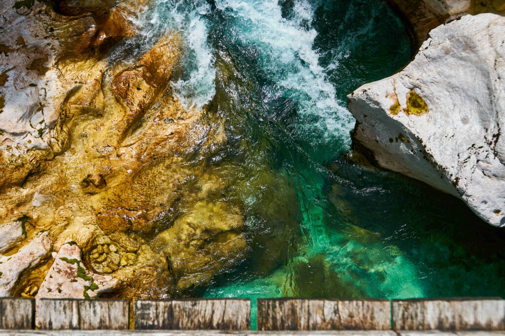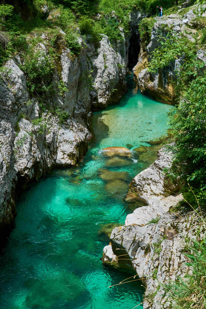 Das Ziel unseres ersten Ausfluges in Slowenien ist das Soca-Tal. Die ca. 11 km lange Wanderung von der großen Soca-Schlucht nach Bovec überrascht uns immer wieder mit malerischen Ausblicken auf die smaragdgrüne, jedoch eisig kalte Soca. Dass es sich (zumindest für uns) mit etwa 8-9 °C nicht um Badetemperatur handelt, dürfen wir gleich zu Beginn unserer heutigen Tour spüren: Der von uns gewählte Wanderweg hat plötzlich ein Ende. Was tun? Den Weg wieder zurück laufen oder den Fluss überqueren? Wir entscheiden uns für letzteres. Also Schuhe aus, Hose hochkrempeln und los. „Verdammt! Ist das kalt!“, jammere ich noch, kurz bevor mir die Luft weg bleibt. Der erste Schritt ins Wasser ist ein Schock. Die weiteren sind nicht weniger heftig. Tapfer stapfen wir weiter. Doch statt sich an die Kälte zu gewöhnen, wird es einfach immer schlimmer. Meine Beine schmerzen oder spüre ich sie überhaupt noch? Ich bin mir nicht ganz sicher und habe permanent nur das andere Ufer im Blick. Wir stehen bis zu den Knien im Wasser. „Jetzt bloß keinen falschen Tritt machen und ausrutschen“, denke ich mir zwischen all den Momenten, in denen mein Gehirn mir permanent nur Warnsignale mit „kalt, kalt, kalt“ sendet. Mir ist schon etwas schwummrig als ich endlich wieder einen Fuß an Land setze. Meine Füße und Beine sind steif. Doch blitzschnell wechseln sie ihre Farbe zu feuerrot und fangen an zu heizen. Die nächsten Meter spazieren wir erst mal barfuß weiter bis sich unsere Füße wieder etwas beruhigt haben. Teils über Schotter, teils über kleine Pfade durch Waldstücke erstreckt sich der Weg am Fluss entlang. Immer wieder wechseln wir mit den Hängebrücken die Seite bis wir schließlich wieder in Bovec ankommen, wo Giorgio geduldig auf uns wartet.