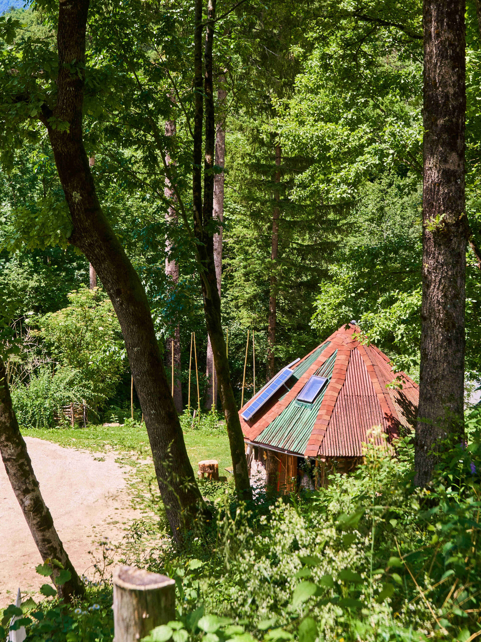 Unsere Glückssträhne hält an und der nächste Stellplatz in Slowenien ist einfach traumhaft. Nachdem wir das Verbotsschild ignorierend auf einem geteerten Weg mitten durch den dortigen Golfplatz gefahren und um die Ecke gebogen sind, befinden wir uns in einem kleinen Paradies. Rund um uns jede Menge Bäume und dichtes Gewächs, die Berge erheben sich im Hintergrund und ein kleiner Fluss schlängelt sich im Tal entlang. Wir erhaschen sofort den Blick auf einige interessante Reisemobile und fühlen uns hier genau am richtigen Ort. David, der Besitzer des Grundstückes, führt keinen offiziellen Campingplatz, da hierfür unglaublich viele Auflagen erfüllt werden müssten. Diese würden jedoch genau die besondere Atmosphäre des Platzes zu nichte machen. Also stellt David seinen Besuchern einfach sein Grundstück zur Verfügung und freut sich über Spenden. Was für eine schöne Idee! Mit einer kunterbunten Mischung aus alten Türen, Fenster und sonstigen Materialien hat er ein nachhaltiges Badehäuschen und eine offene Küche gebaut. Das Wasser kommt aus einer Quelle im Wald und auf den Schutz der Umwelt wird Wert gelegt. Wow! Wir sind so von der besonderen Stimmung dieses Ortes gepackt, dass wir die nächsten drei Nächte hier verbringen.
