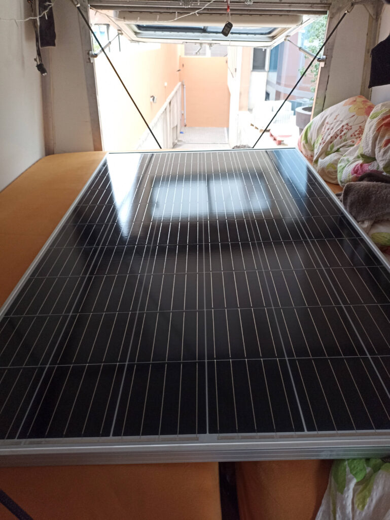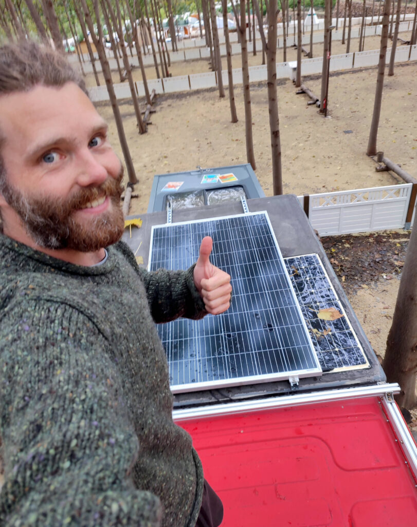 Da sind wir nun, am Rand einer viel befahrenen Straße, an der Autos und LKWs vorbeischießen. Der halbe Inhalt des Busses steht draußen neben einer Parkbank, es beginnt zu nieseln. Bald dämmert es. Löcher anzeichnen, bohren, flexen, schrauben. Sven auf Giorgios Dach, ich am Boden versuchen wir die Installation vor Einbruch der Dunkelheit fertig zu bekommen. Passanten gehen erstaunt vorbei, bleiben stehen. Sieht man wohl nicht alle Tage. Glücklicherweise schaffen wir es gerade rechtzeitig. Nächster Morgen. Es ist ein bewölkter Tag. Doch das ist für diese Platte kein Hindernis. Der Akku lädt und wir freuen uns wie Bolle.