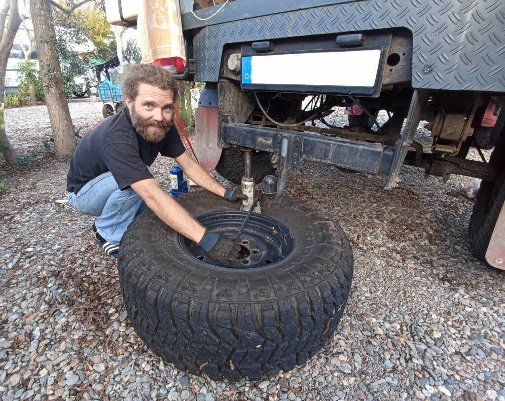Einige Kilometer und Stellplätze weiter will Sven es dann doch wissen. Mit vollem Körpereinsatz lockert er die Radmuttern und entfernt den Reifen. Um nun an das Ventil an der Innenseite zu gelangen, muss der Mantel runter. Dafür bedarf es einer ordentlichen Krafteinwirkung. Kurzerhand schnappt sich Sven den Wagenheber und positioniert diesen zwischen dem Reifen und Giorgio. Ein paar Mal auf- und abhebeln. Und dann? Stückchenweise gibt der Mantel nach bis er sich von der Felge trennen lässt. Unser alter Haushaltsgummi ist schön verklebt immer noch um das Ventil herum zu erkennen. Nun wird es aber Zeit für eine richtige Dichtung.